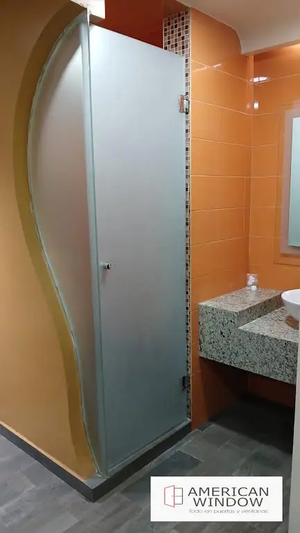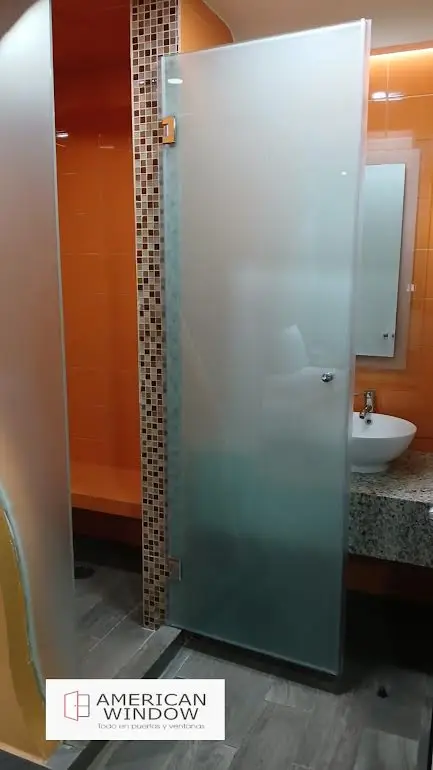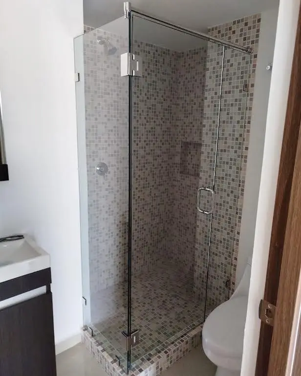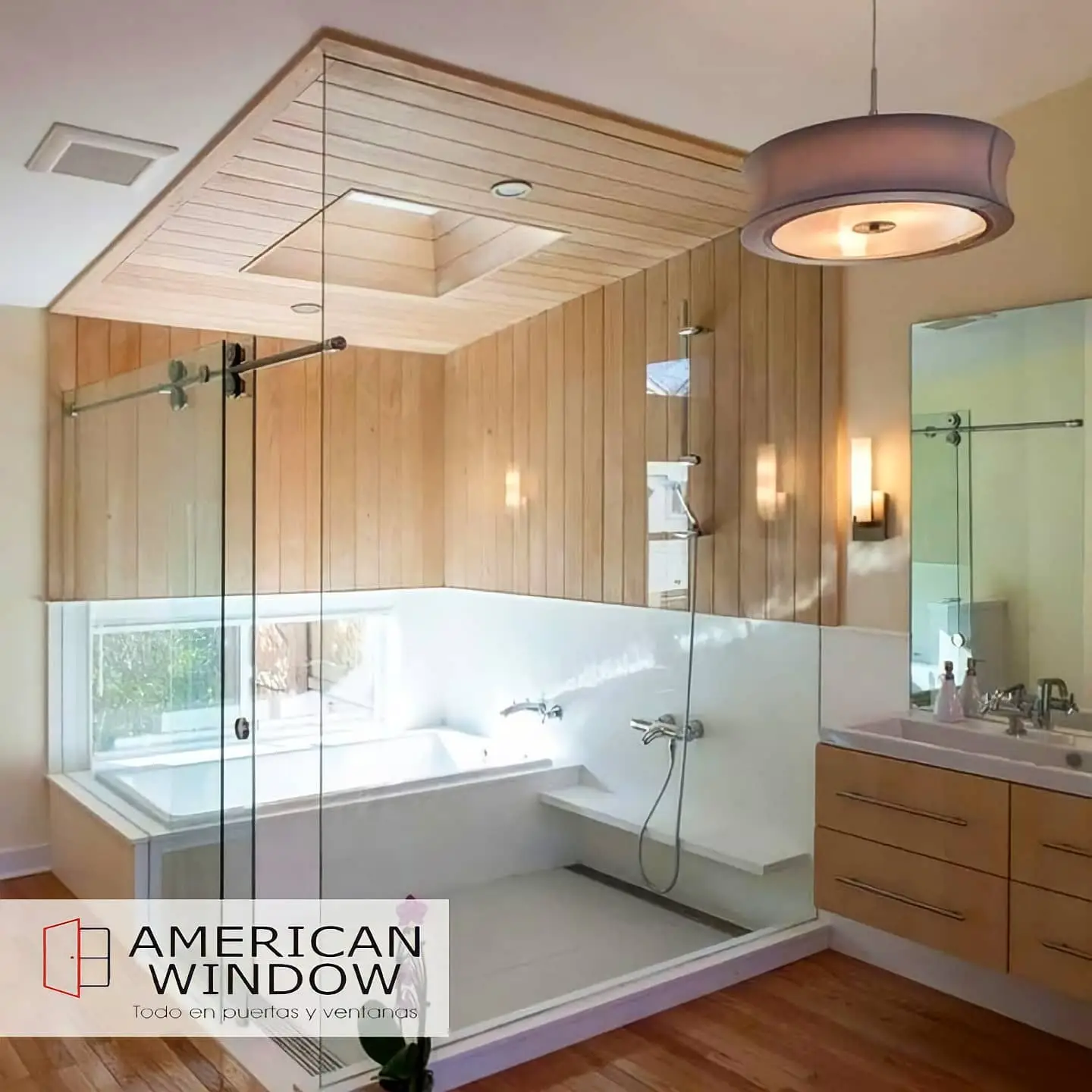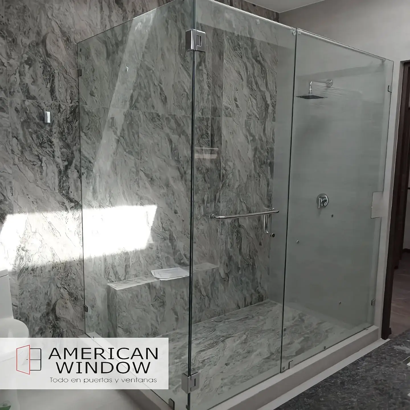 Dale un toque moderno y elegante a tu baño con esta puerta de vidrio templado. Su diseño de líneas limpias y estructura minimalista realza los acabados de mosaico, brindando amplitud visual y estilo contemporáneo.
